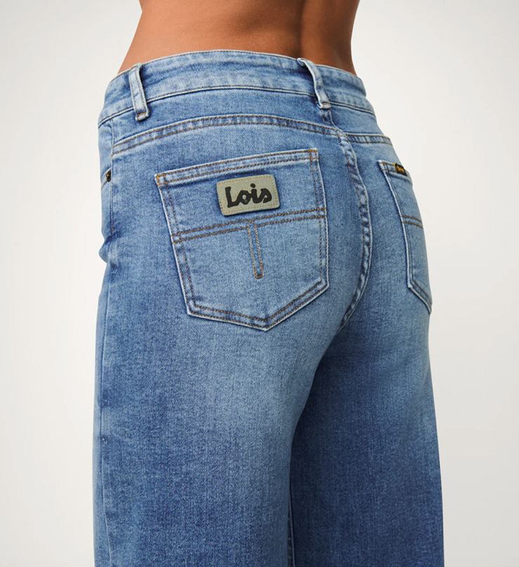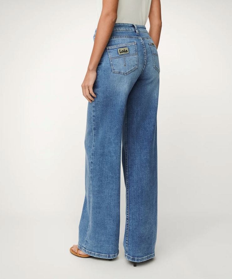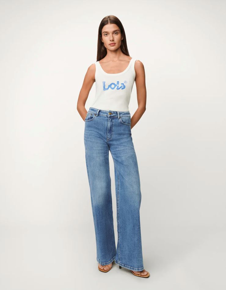 Palazzo - Mallow Stone från spanska varumärket Lois. Vida jeans med hög midja i en snygg, varm ljusblå tvätt med mycket stretch. Perfekt passform.