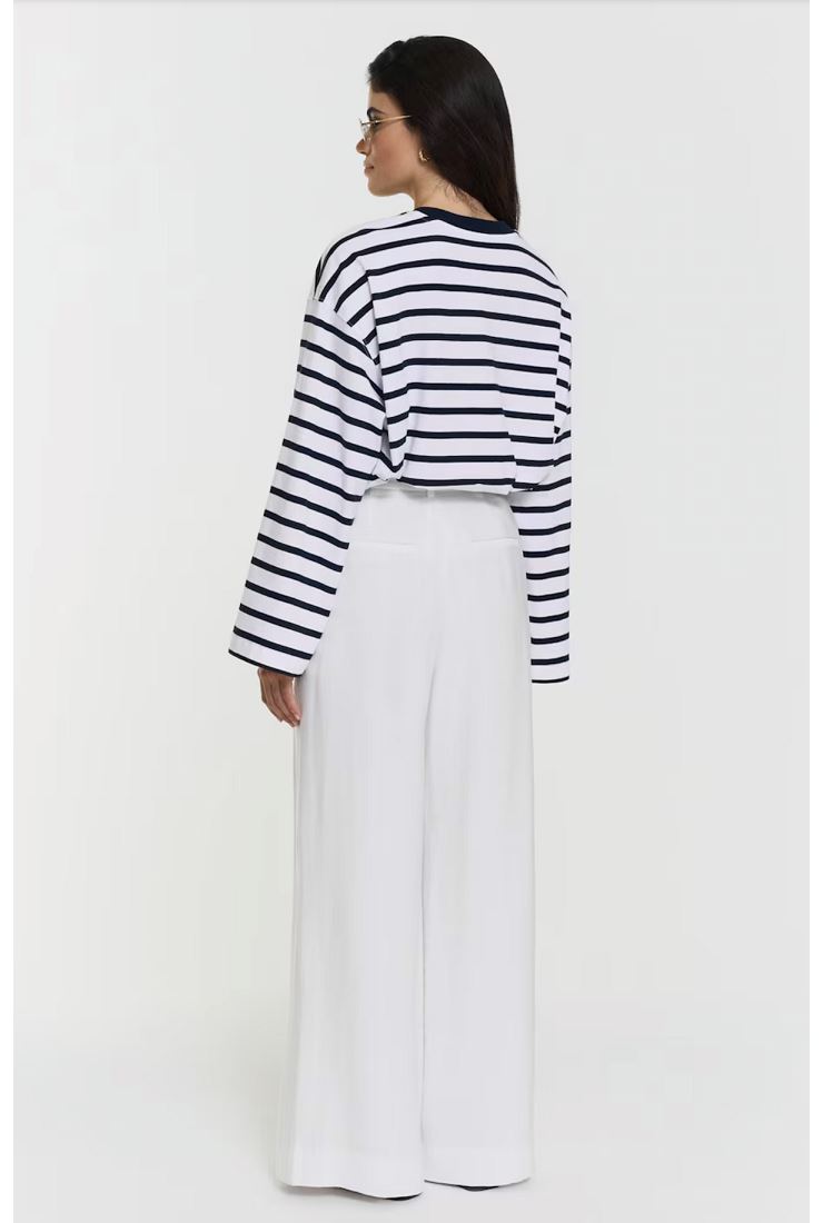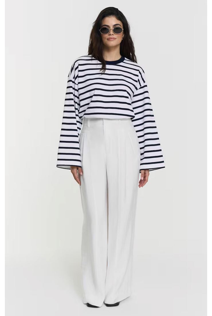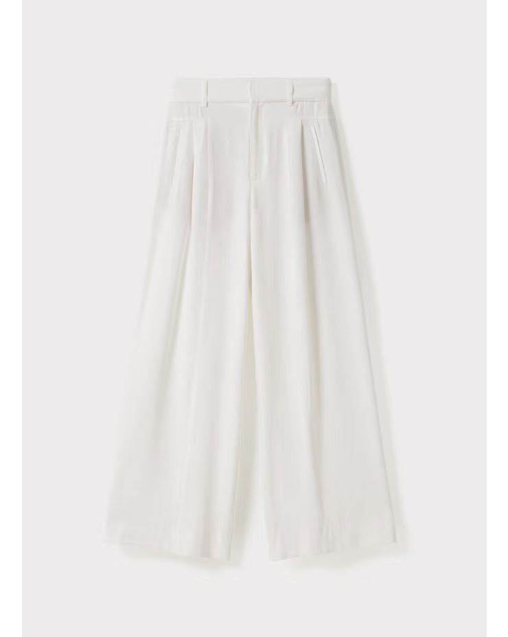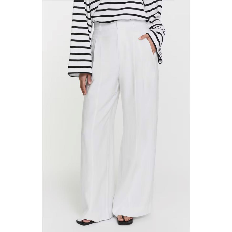 Stilrena byxor med vida ben, sydda pressveck och frontveck och hög midja i ett tunt och följsamt material. Skräddad modell med diskreta fickor och dold gylf framtill. Snygga att bära både till fest och vardags. Här i färgen: Ivory.