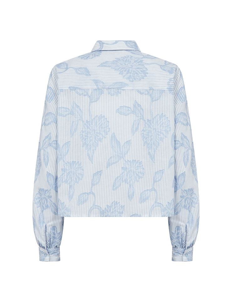 Ljusblå skjorta med ränder och fint blommönster. Lös passform, något kortare i modellen. Krage och knäppning. Luftig bomullskvalitet. Kombinera med vida kostymbyxor eller ljusa jeans.