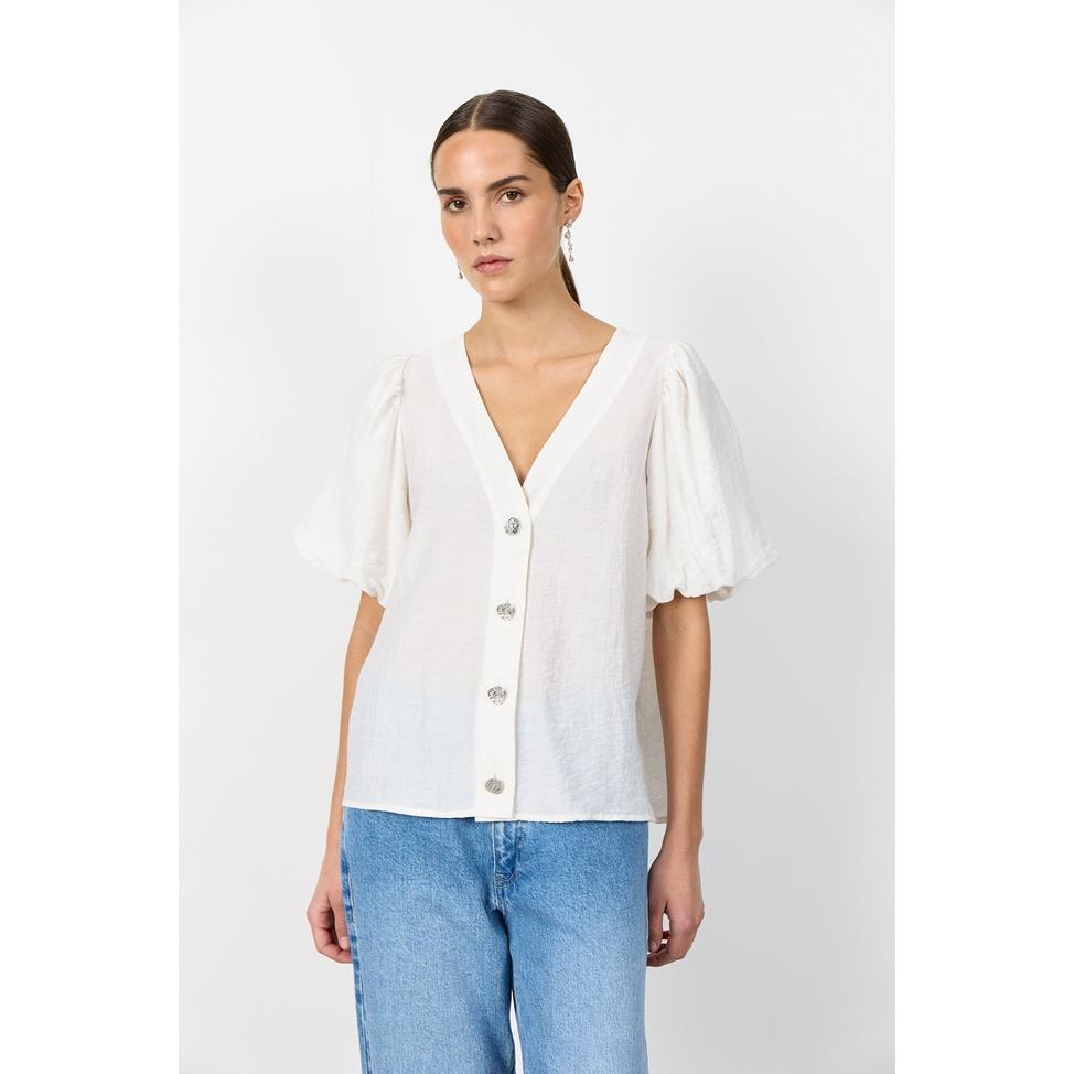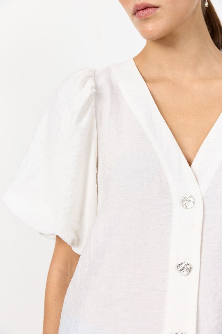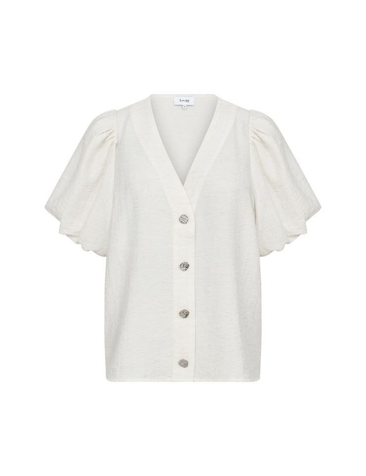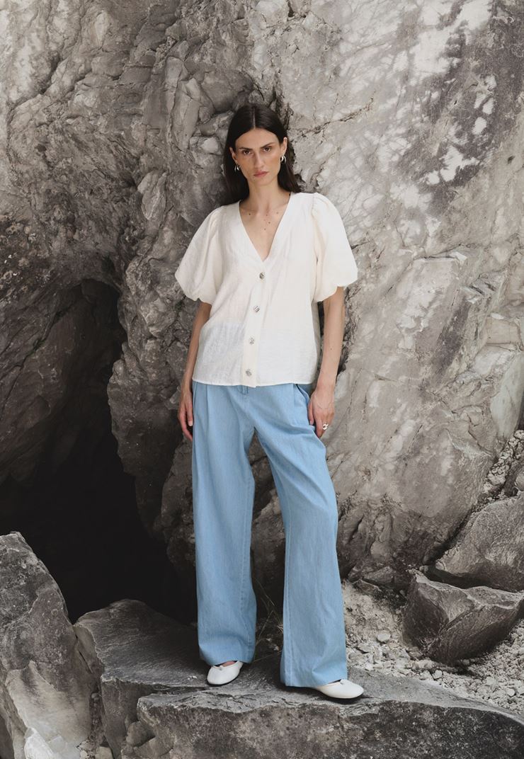 Palina 2 är en stilren och bekväm blus i viskosmix med linne som ger en luftig och skön känsla. Den feminina V-ringningen, de korta puffärmarna och de dekorativa knapparna framtill skapar en elegant silhuett. Perfekt blus att matcha med både högmidjade byxor och kjol – ett mångsidigt plagg för både vardag och fest.