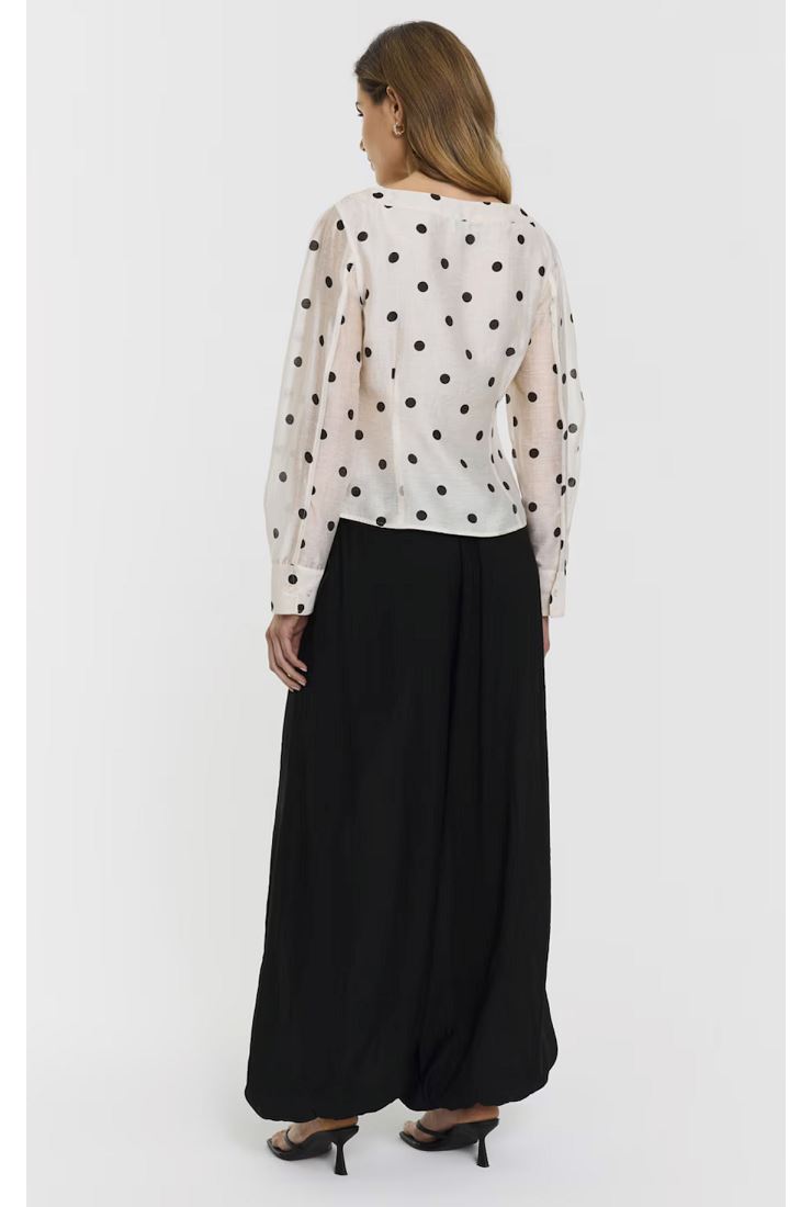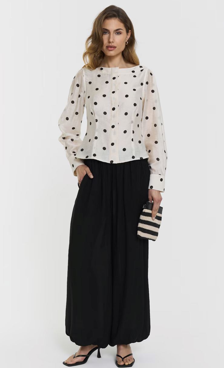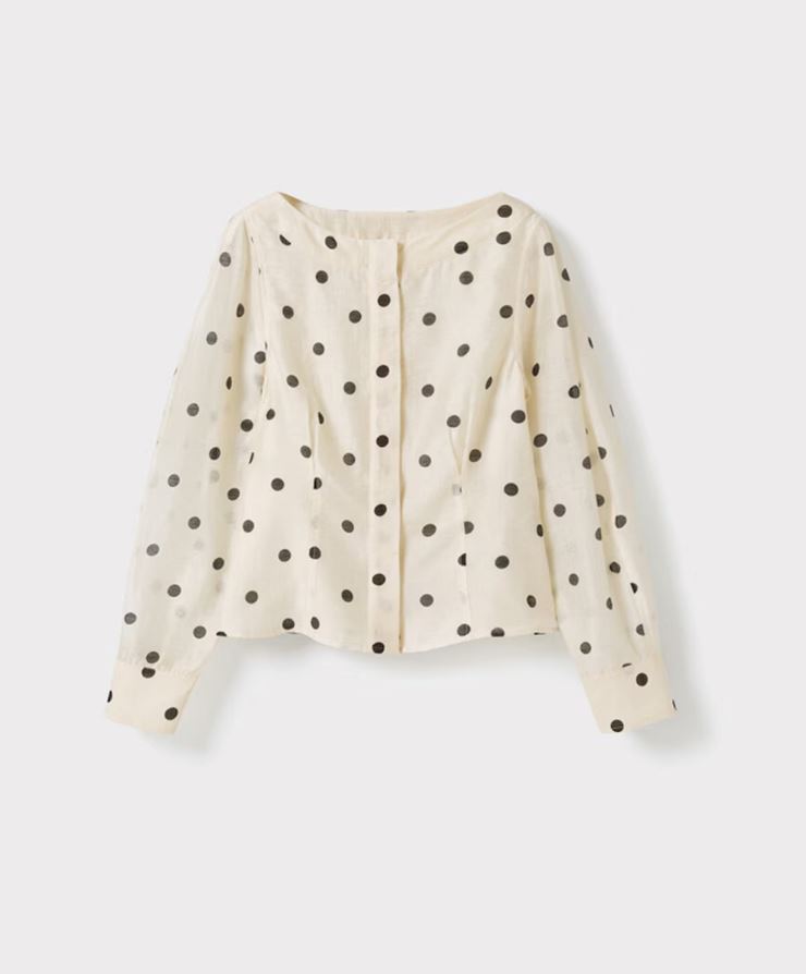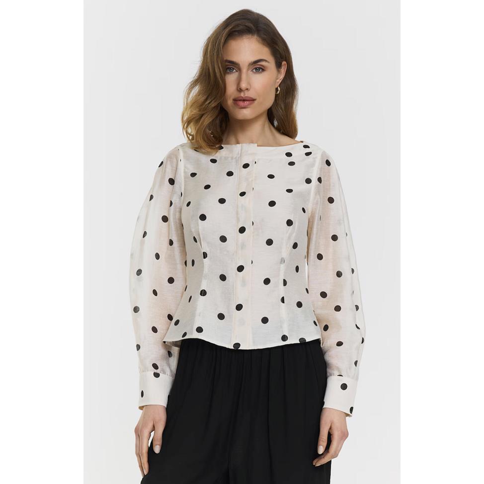 Maika Blus har en båtringad halsringning, dold knappslå och figurnära midja som framhäver siluetten. Den prickiga, formsydda designen ger en feminin och stilren look, perfekt som vardagsblus eller festblus. En elegant och tidlös favorit i garderoben.