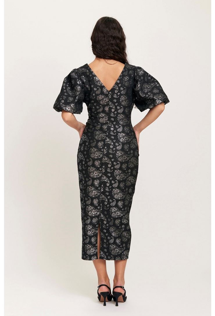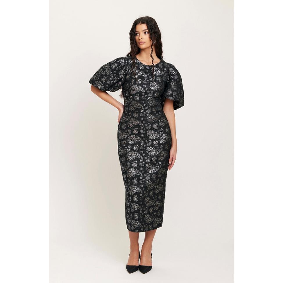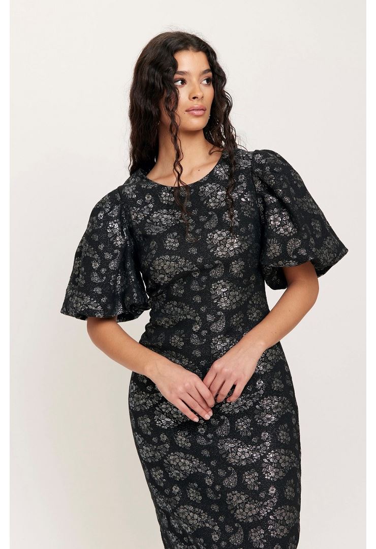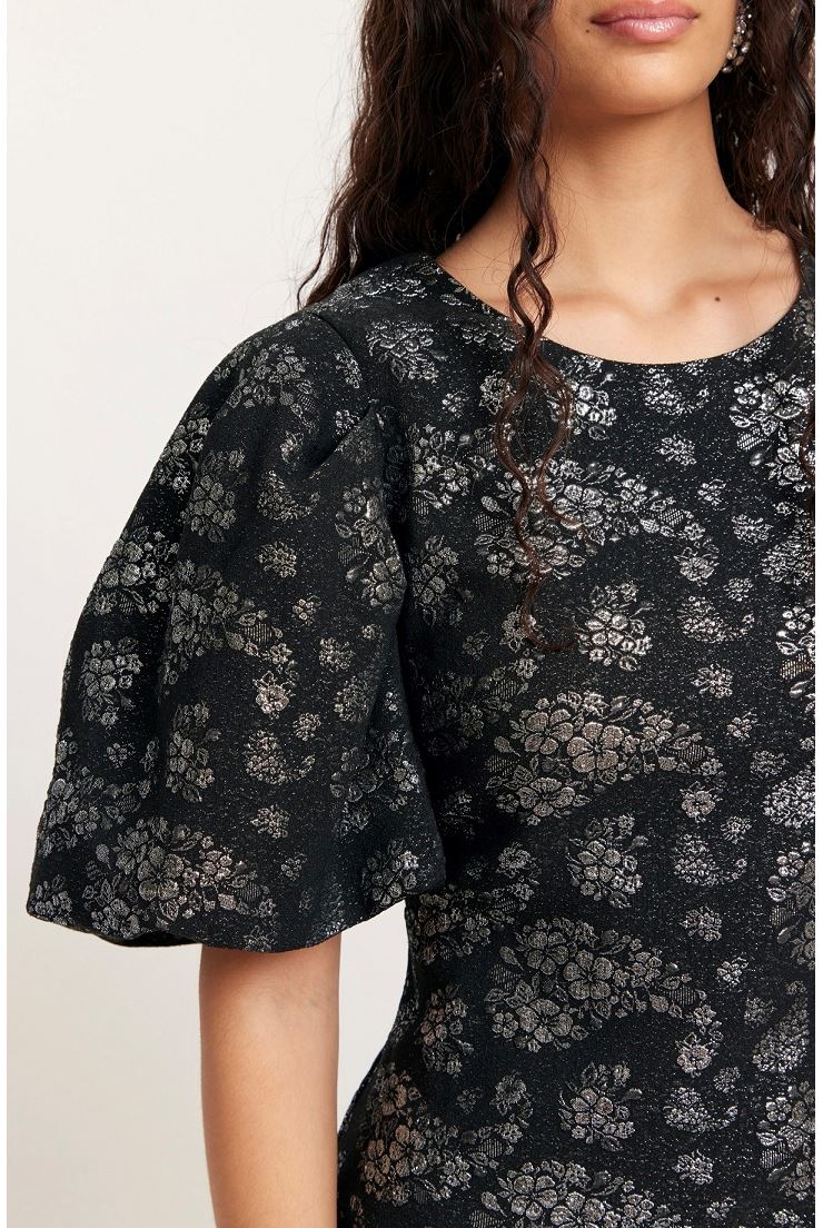 Liz Long Dress är en stilren midiklänning i svart tyg med fina silvriga blommor. Den har en figurnära passform som framhäver kroppen på ett elegant sätt. Klänningen har korta puffärmar, rund halsringning och en smidig dragkedja i sidan.