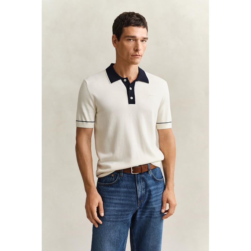 Kortärmade tröja i en lyxig blandning av bomull och modal som ger en mjuk yta och skön känsla. Med regular fit, pikékrage, kontrasterande knappslå med randiga detaljer, ribbstickade fållar och ärmslut samt pärlemorknappar blir den både stilren och tidlös. Broderad Gant-logo på bröstet ger en subtil, klassisk touch. Perfekt för både vardag och fritid.