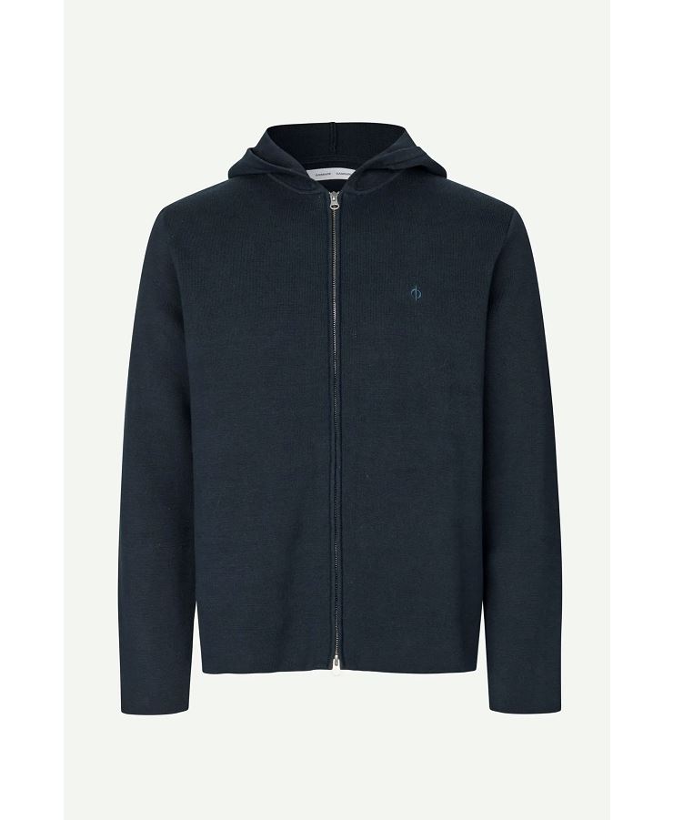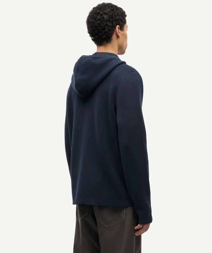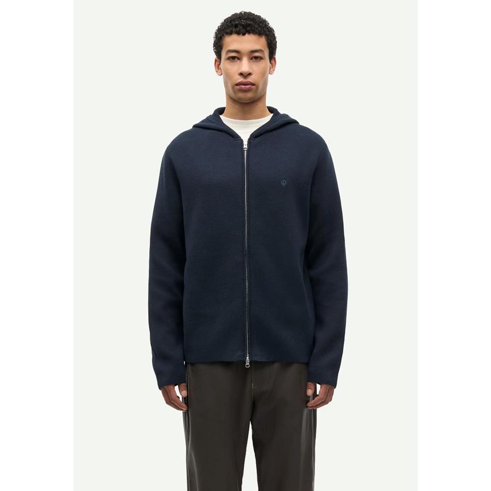 Stickad hoodie i en mjuk och slitstark bomullsmix. Rak passform med luva och tvåvägsdragkedja framtill. Diskret broderad logga på bröstet. Perfekt för en avslappnad och stilren vardagslook.