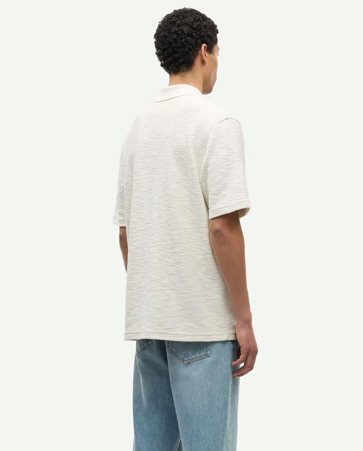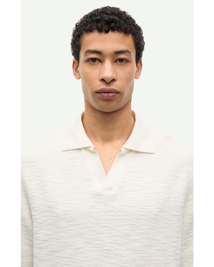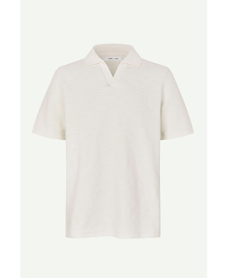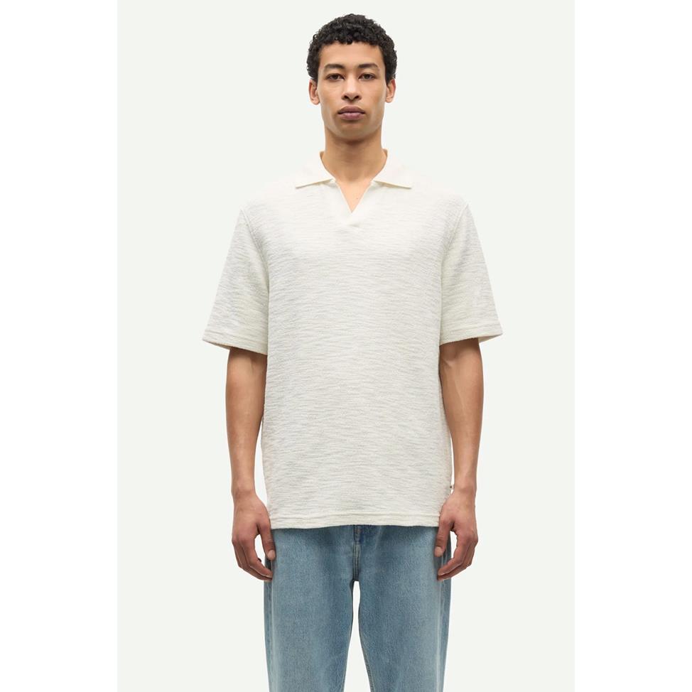Stilren kortärmad piké med V-ringning och stickad krage. Tillverkad i mjuk, ekologisk bomullsblandning med fin struktur.