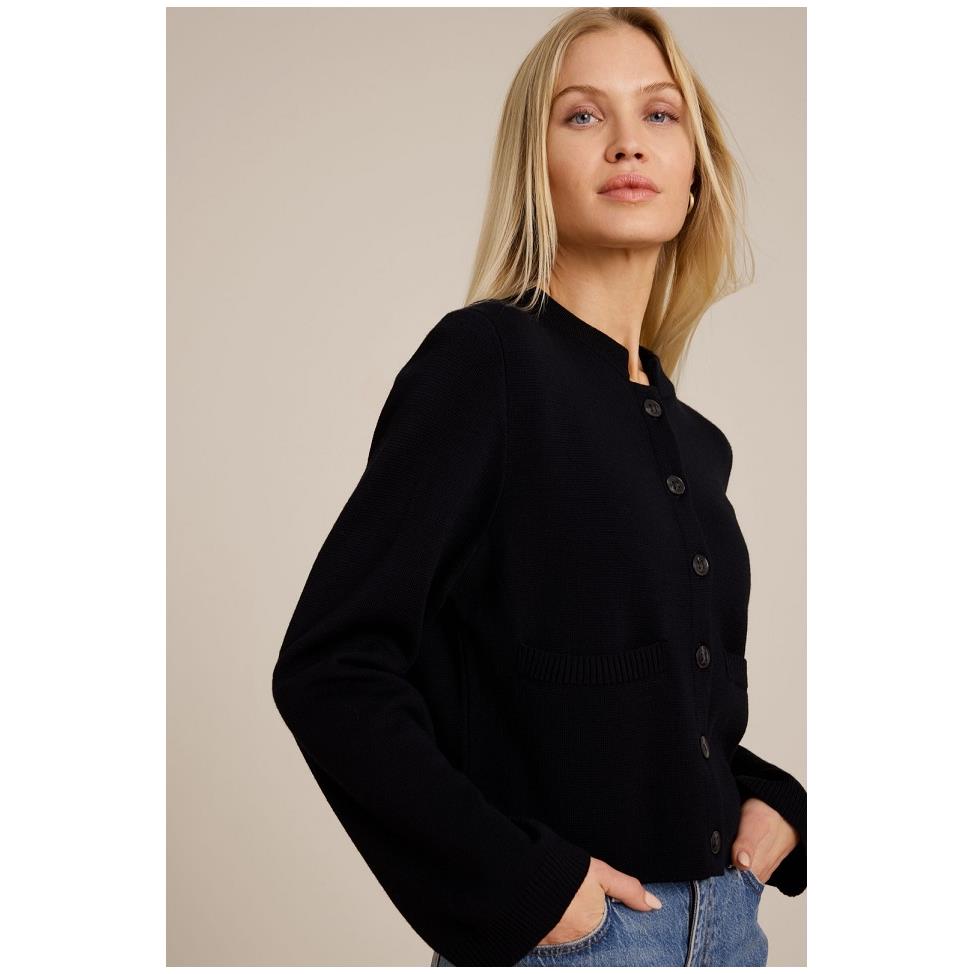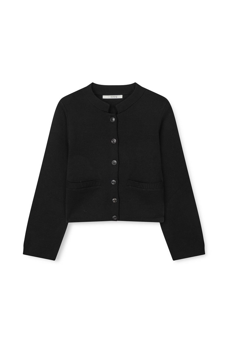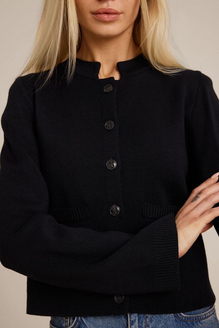 Stickad kofta i en fin och tätstickad ullmix med struktur. Rak passform med ståkrage och knäppning framtill. Ribbade avslut och detaljer.