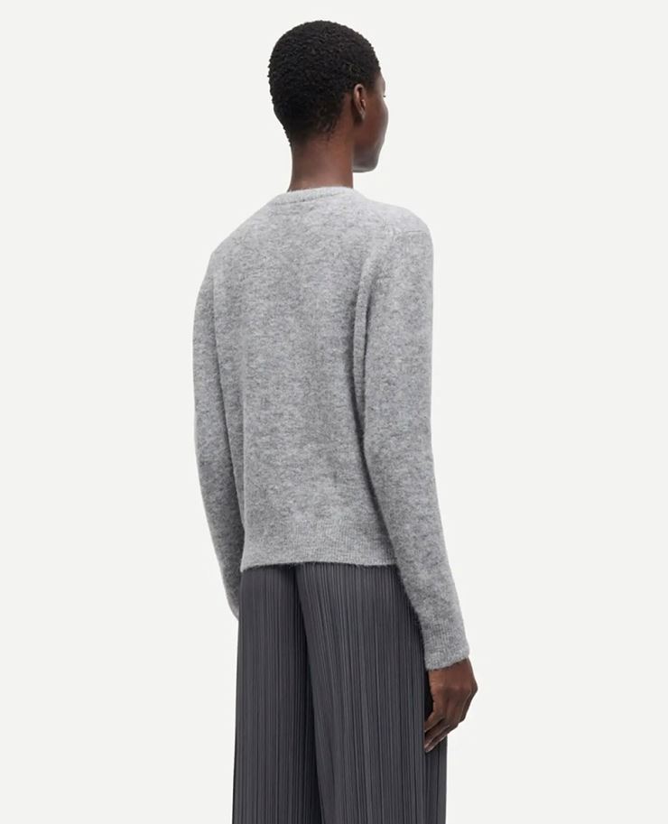 Den ribbstickade kragen, muddarna och fållen ger en fin struktur och en mjuk avslutning. Tillverkad i en elastisk ullblandning med alpackaull, vilket ger både värme, följsamhet och en lyxig känsla mot huden.